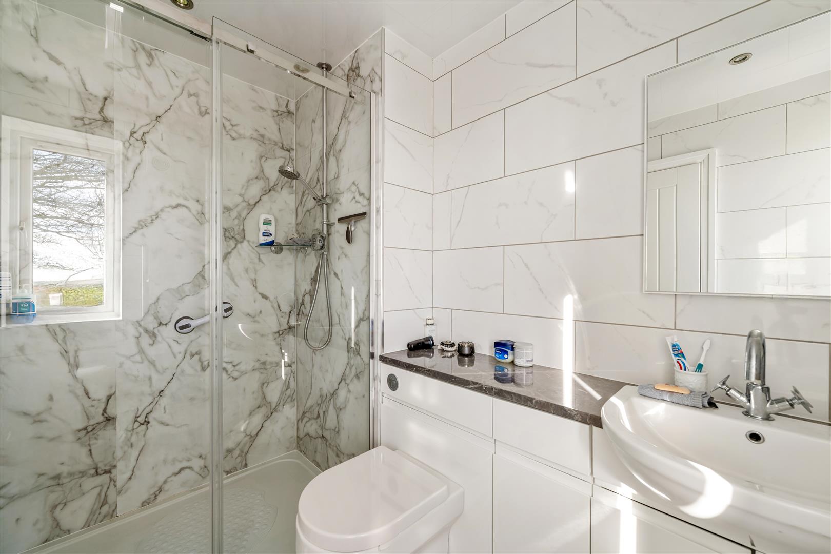 Double continental shower. Marble effect ‘Mermaid’ style boarding to shower enclosure. W.C. and wash hand basin in vanity unit finished in white high-gloss with storage. Veined marble tiling to remaining water sensitive areas. Chrome heated towel rail. Window to rear.