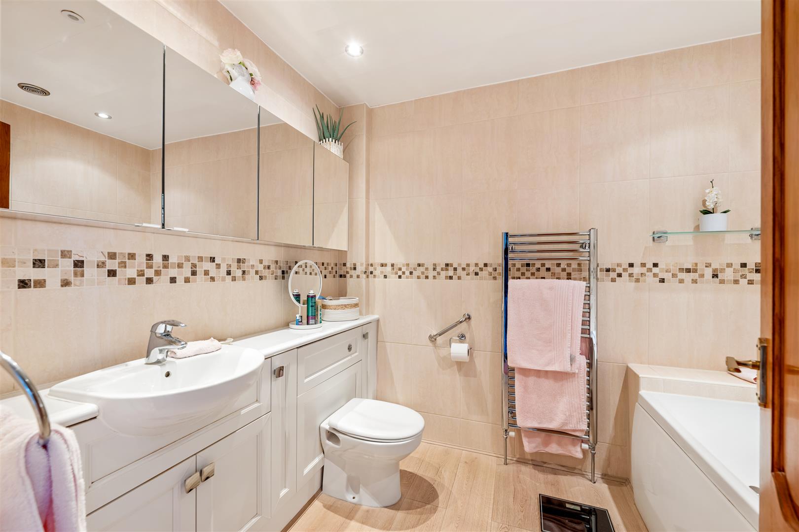 White suite of panelled bath with shower and screen over. Wash hand basin and W.C. with concealed cistern all set in white high-gloss finish vanity unit having fitted cupboards. Tiled to full height with mosaic effect border tile. Heated chrome towel rail.