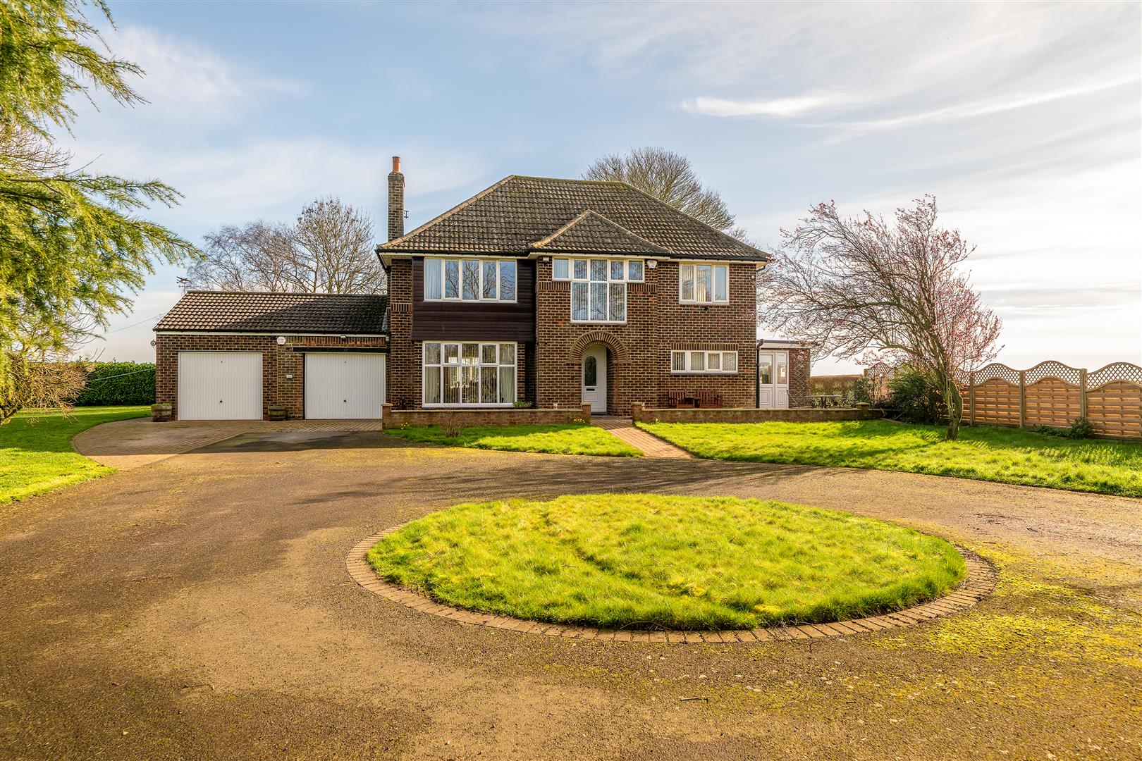 Expanse of lawn. Mature hedges and trees. tarmac driveway providing parking for numerous vehicles and access to the Turning Circle and Double Garage. Additional block paved parking area.