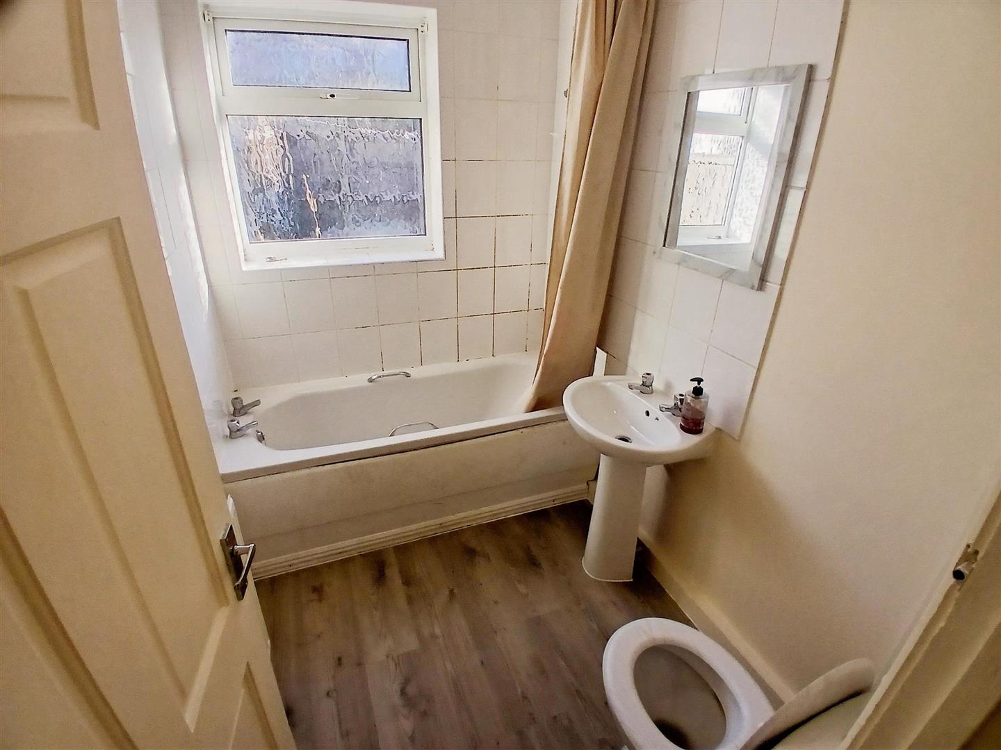 Panelled bath with T80 Triton electric shower over, tiled splashback, pedestal wash basin, low flush WC, Laminate flooring, radiator.