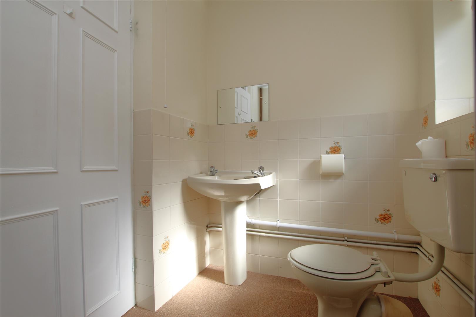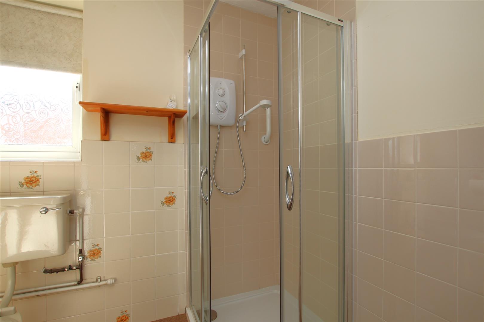 Single shower unit with toilet and matching sink, with radiator and window to the south west.