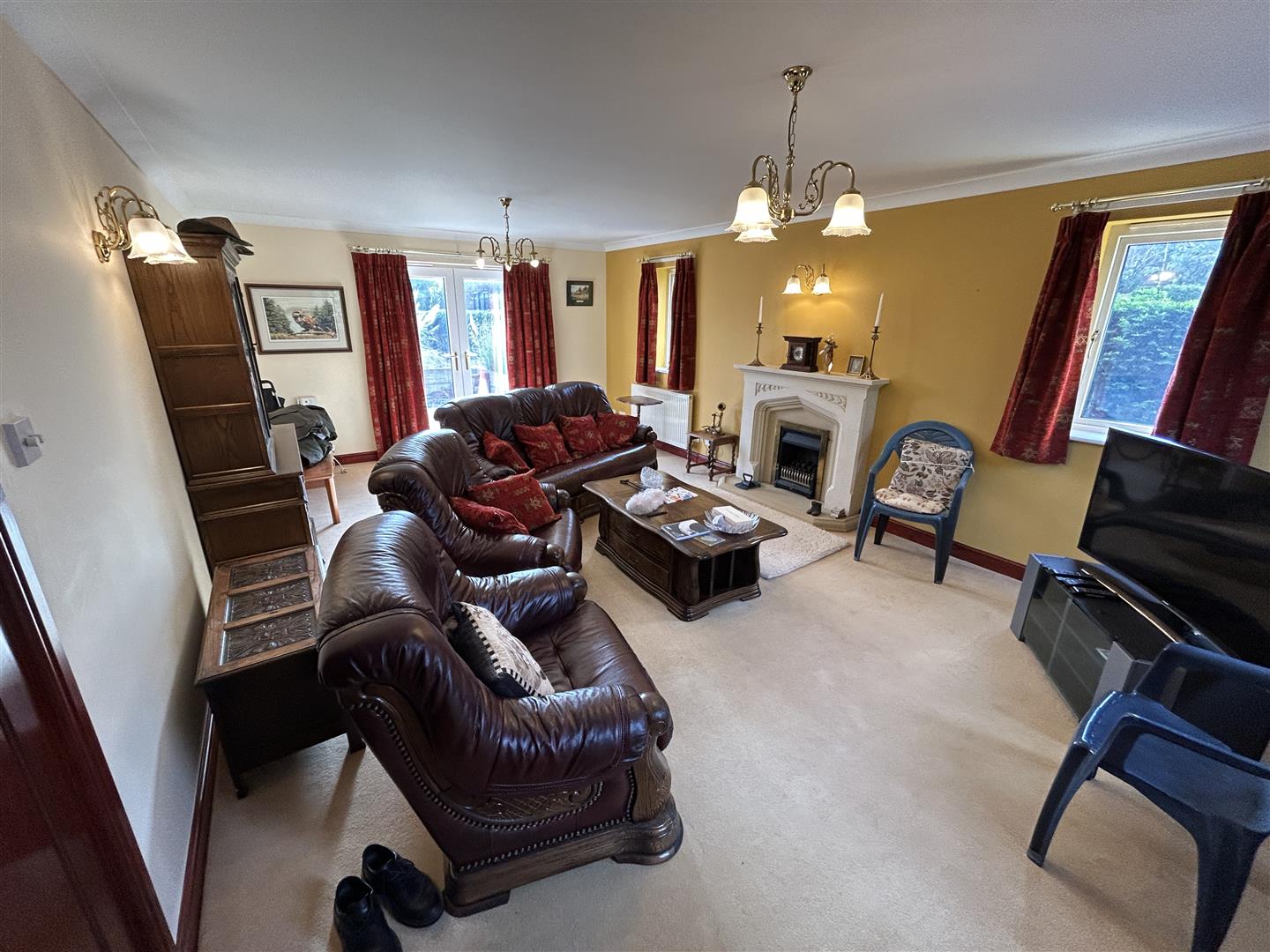 Entered through two double wooden doors. Large room with a coal affect gas fire and there are patio doors to the rear of the property leading on to the patio.