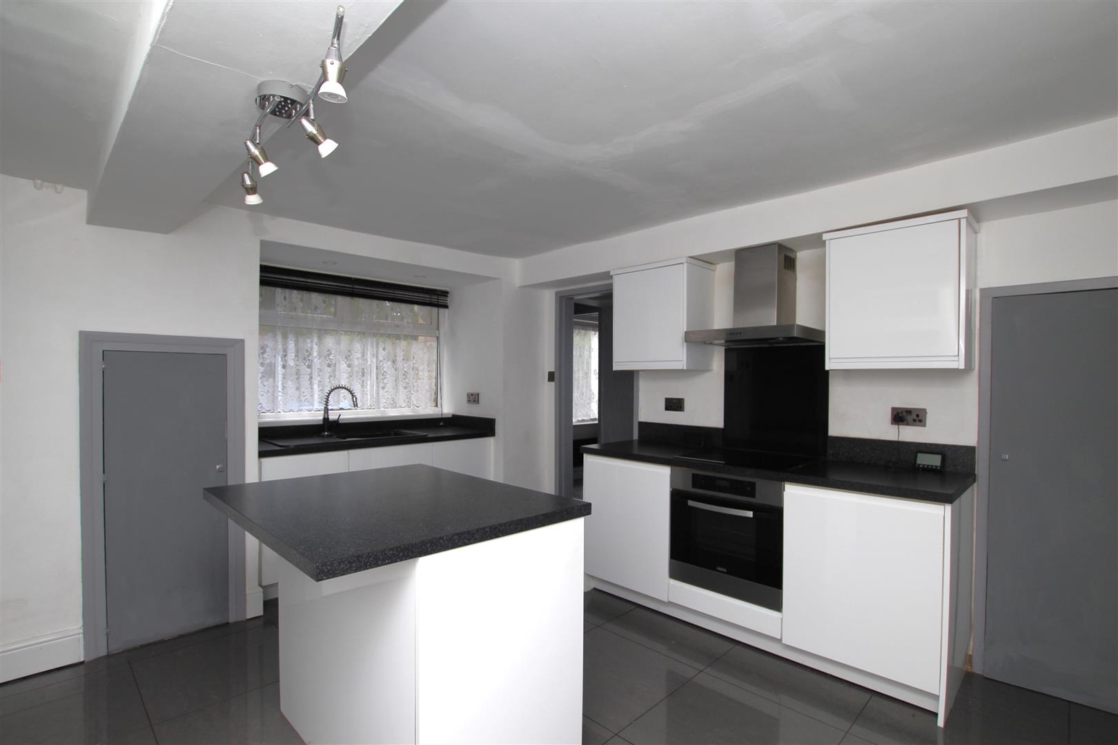 Range of white high-gloss finish wall and base units with black roll top work-surfaces. Single drainer sink top. Matching island with drawers. Built-in electric oven, hob and extractor. Under-stairs pantry. Grey Porcelain style tiled floor. Double radiator. Window to front. Additional storage cupboard. Door to:-