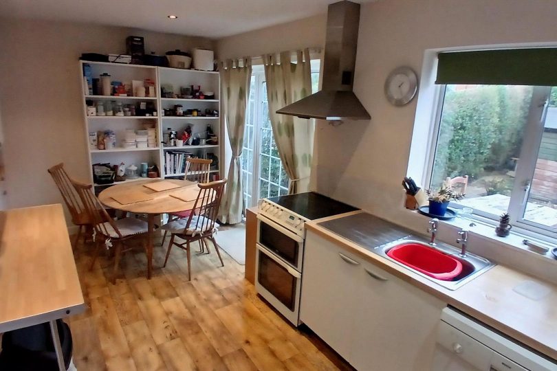 Further range of matching base units with cupboards and drawers below, shelving and wall cupboards over. Double glazed French doors and window overlooking rear garden, replaced Ideal Gas combi boiler, Hardwood side door.
