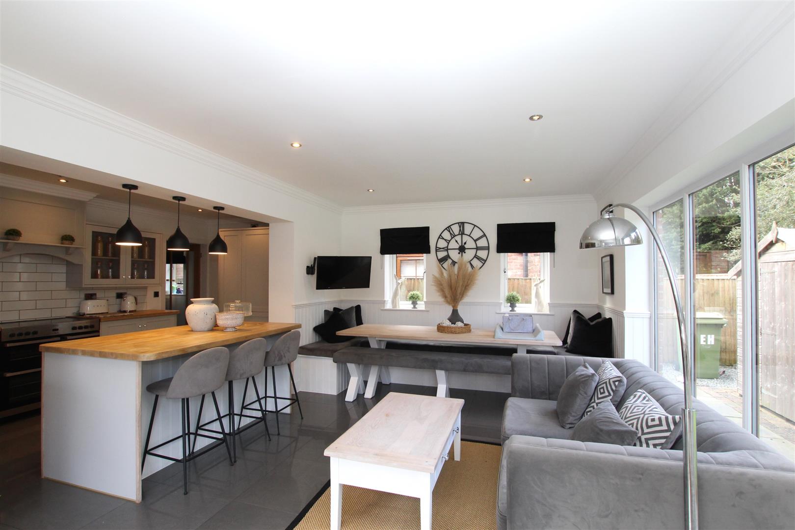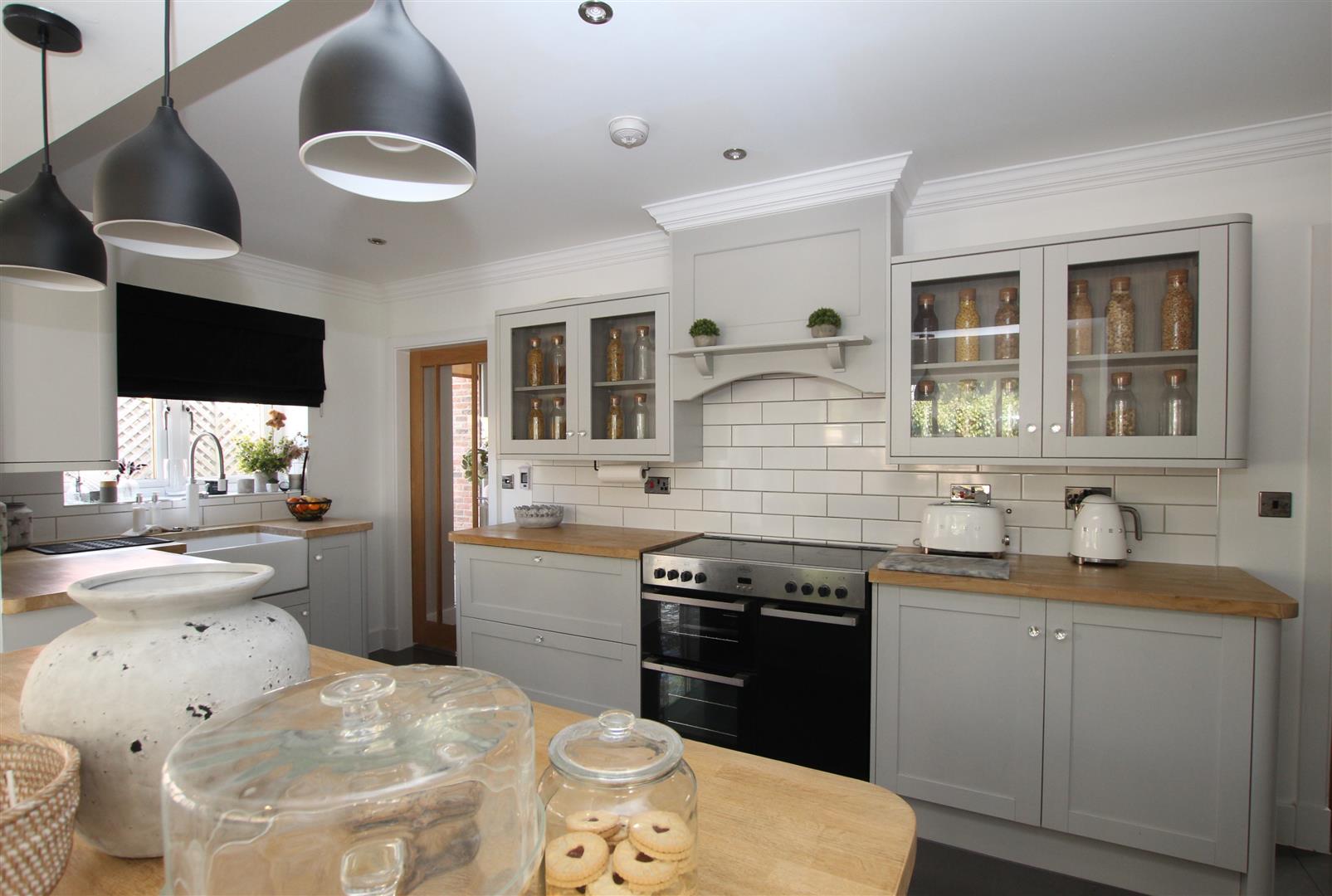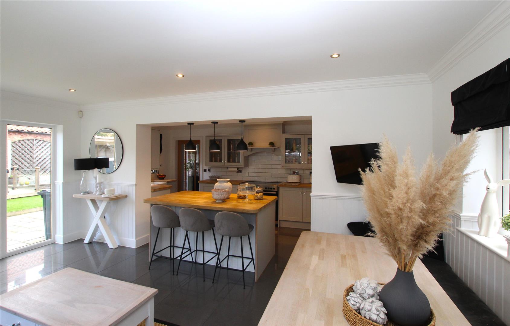 Modern light grey wood grain effect panelled wall and base units with soft finish edges. Two wall mounted glass display cabinets. Larder unit. Oak work-surfaces with Belfast sink and Smeg mixer tap. Space for range cooker with concealed extractor over. White rectangular tiled splashbacks. Matching central island/bar with cupboards under and wine cooler. Grey porcelain tiled floor. Three windows to the sides plus picture window to rear. uPVC double glazed, double doors and matching side screen to garden. Door to:-
