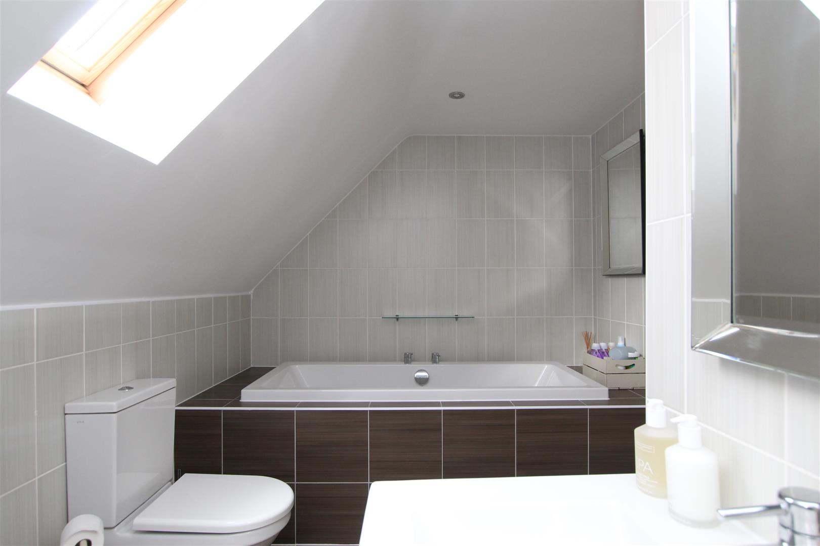 White suite of double ended bath with central tap. Low Level W.C. ‘Wet-Room’ style shower area with ‘Rain Shower’ and second attachment plus glass screen. Two Velux rooflights. Tiled floor with contrasting tiled walls.