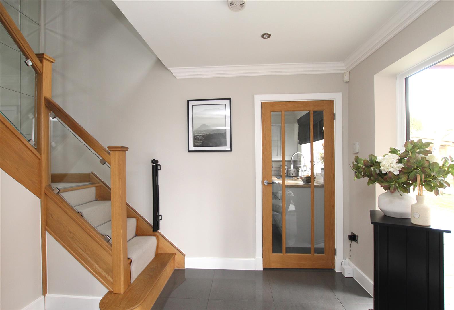 Grey Porcelain tiled floor. Coving. Picture window overlooking the garden to side.. Oak stairs to First Floor Landing with glass panel inserts. Mirrored feature wall.