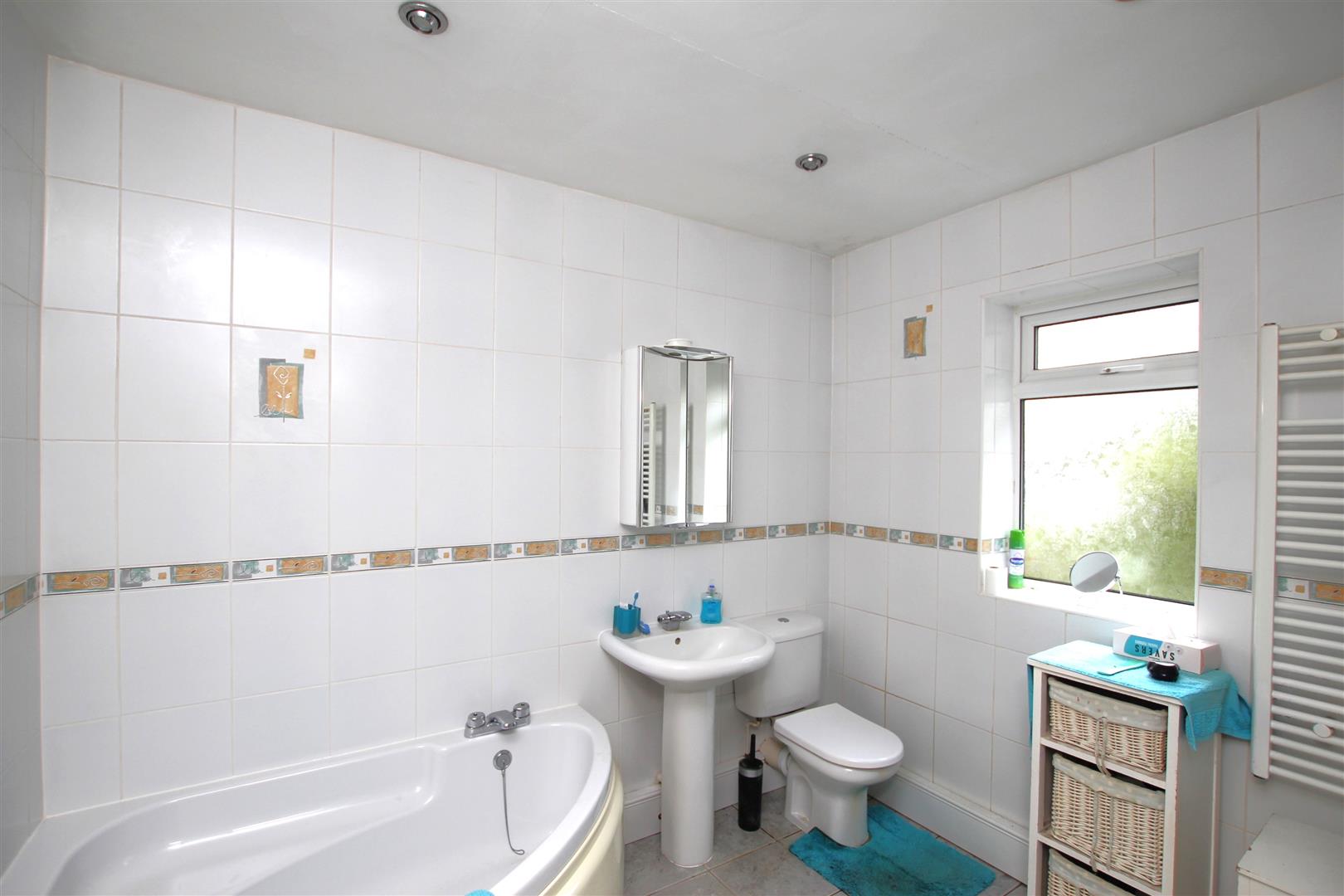 White suite of panelled corner bath. Double step-in shower. Low Level W.C. Pedestal wash basin. Tiled to full height and tiled floor. Radiator. Window to side. White heated towel rail.