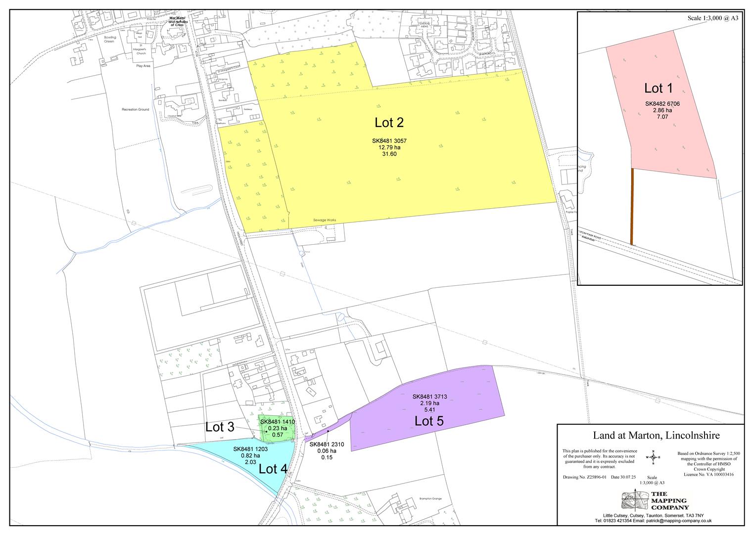 A public footpath crosses Lot 2 (east to west) on the north edge.