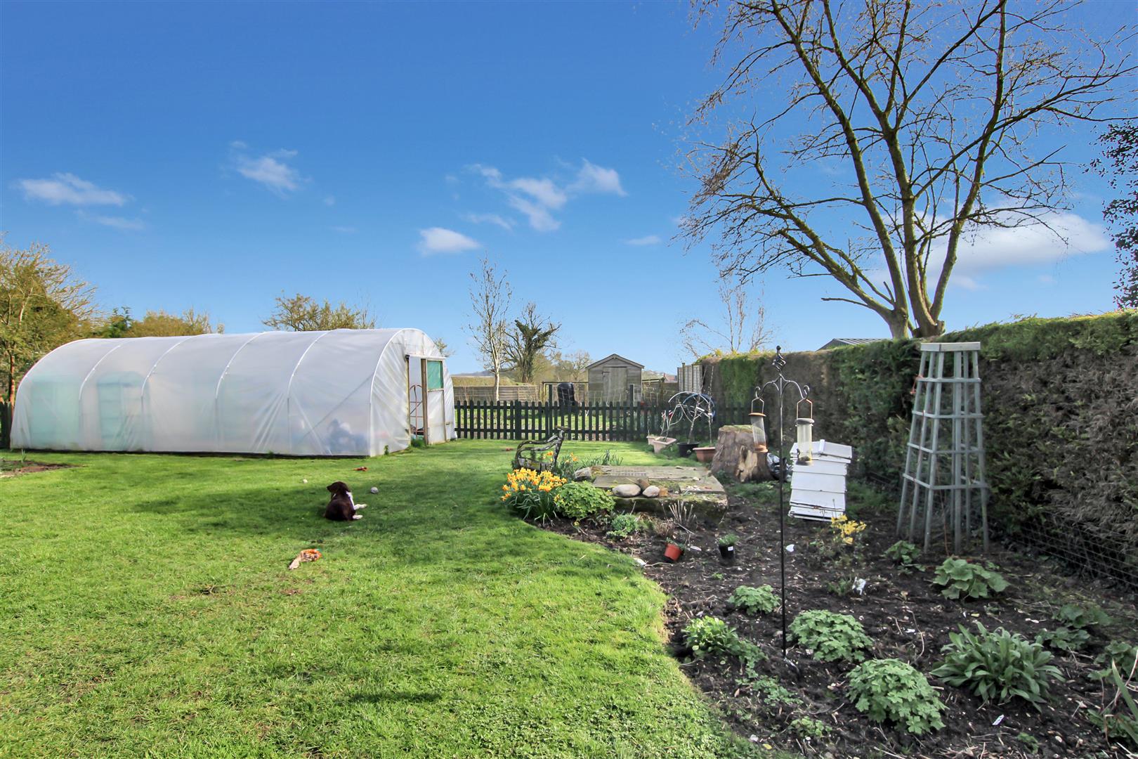 Gated access. Pebbled patio. ‘Kitchen/Herb Garden’ area. Expanse of lawn. Workshop/Shed with light and electric. Greenhouse. Polytunnel. Picket fence and gate to Vegetable Garden which has an additional shed.
