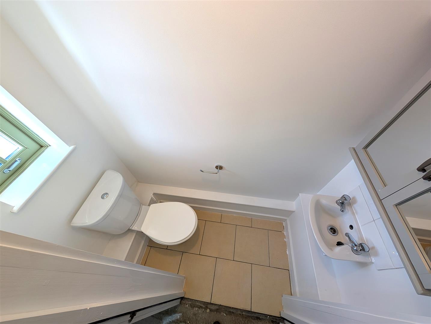 Sash effect sage green painted double glazed window to the front elevation, low level flush wc, wall mounted wash hand basin with splash back wall tiling, white painted walls, extractor fan, central ceiling light, cream floor tiling, Eco under floor heating
