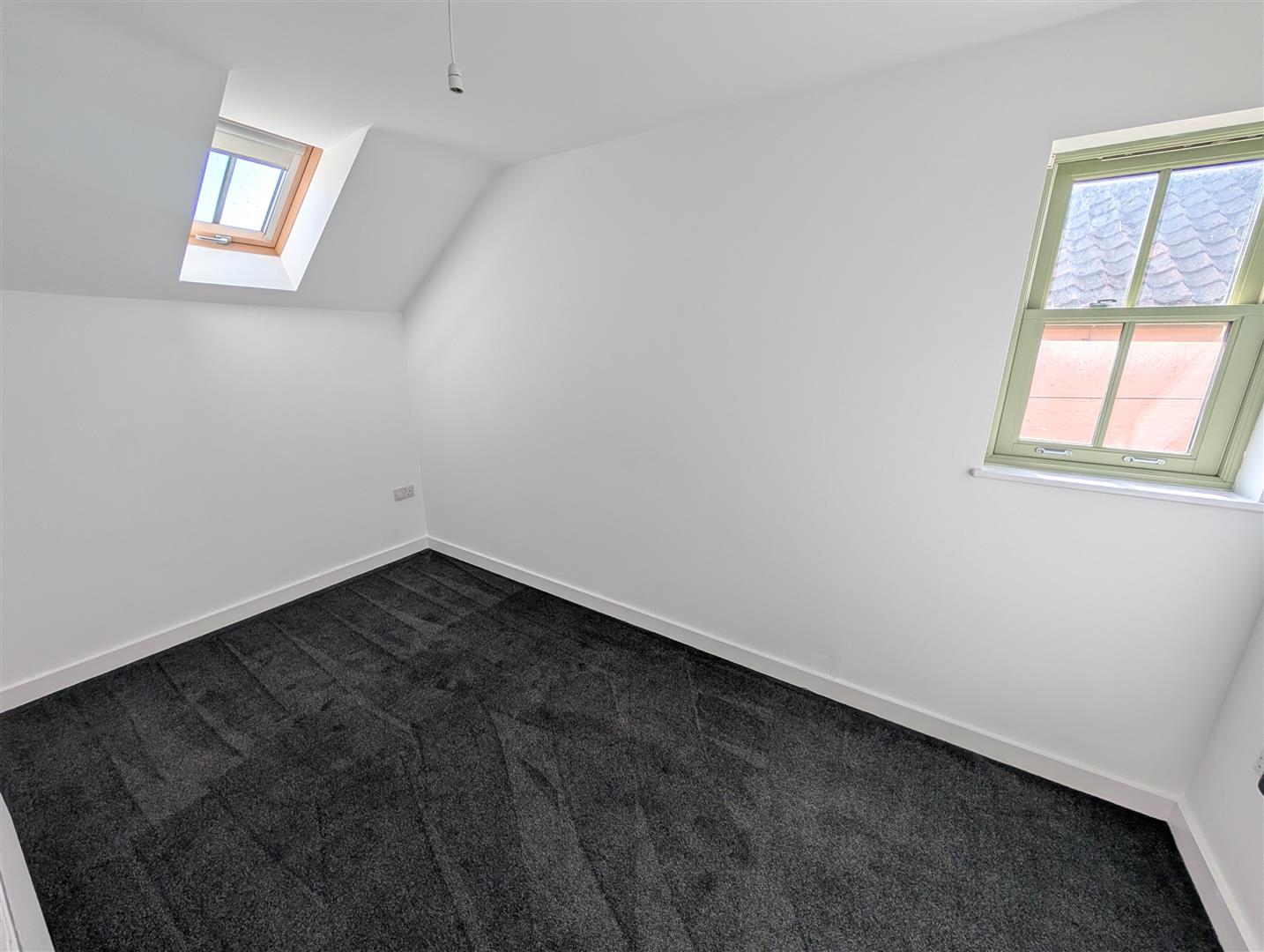 Velux window with fitted grey blind, sage green sash effect window to the side elevation with fitted grey roller blind, white painted walls, central heating radiator, television point.