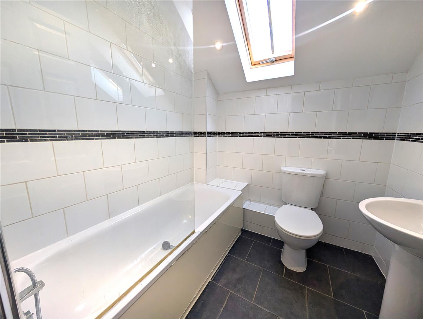 Velux window, white suite comprising: bath with telephone style combination tap and shower head incorporating an additional chrome shower head and hose, glazed shower screen, pedestal wash hand basin, low level flush wc, mainly wall tiled in white high sheen having mosaic effect grey and black border tile, chrome towel rail, grey floor tiling.