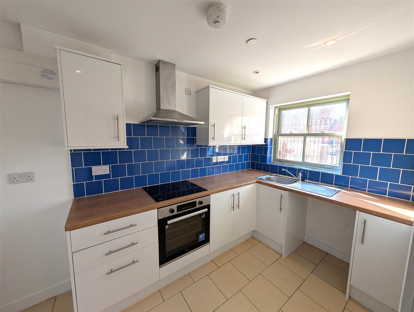 Sash effect sage green painted double glazed window to the front elevation, fitted with a range of white high sheen wall base and drawer units with chrome handles having complementary block beech working surfaces above, stainless steel sink unit and drainer, part tiling to the walls in high sheen blue, space and plumbing for washing machine, space for fridge freezer, white painted walls, built in stainless steel single oven with 4 burner ceramic hob above, stainless steel extractor canopy, Eco under floor heating, wall mounted fuse box, cream floor tiling.